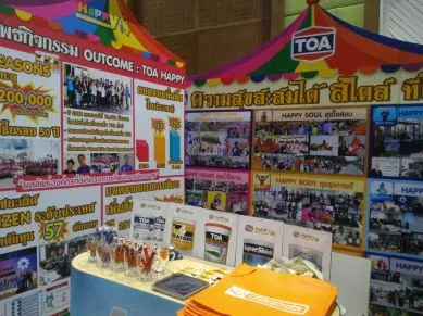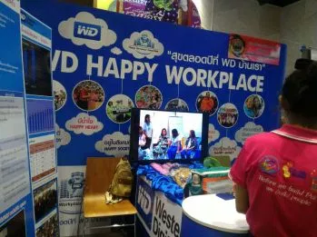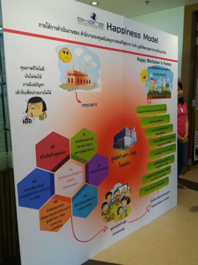 ภายในงานเป็นการออกบูธนิทรรศการแสดงผลงานในการดำเนินโครงการ Happy Workplace ของกลุ่มองค์กรภาคเอกชนต่างๆ เช่น โครงการ “สามมิตร สร้างสุข สร้างสังคมสันติสุข” ของกลุ่มบริษัทสามมิตร, โครงการ “ปรับนิดชีวิตเปลี่ยน ของกลุ่มบริษัทซีพีเอฟ”, โครงการ “ความสุขสะสมได้ สไตล์ที โอ เอ” ของบริษัทสี TOA, โครงการ “Easy Work life” ของบริษัท ESSILOR , โครงการ“รักฉันนั้นเพื่อเธอ” ของสถาบันการแพทย์ฉุกเฉินแห่งชาติ (สพฉ.), โครงการของบริษัทเอฟบีที และไร่กำนัลจุล เป็นต้น นอกจากนี้ศูนย์ Happy 8 Workplace ได้มาร่วมออกบูธในนิทรรศการนี้ด้วย