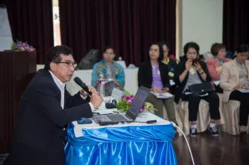 โดยตัวแทนนักสร้างสุของค์กรที่มาจาก 3 หน่วยงานนั้น เน้นแลกเปลี่ยนเรื่องสภาพบริบทของหน่วยงาน ประสบการณ์การดำเนินกิจกรรมโครงการพัฒนาคุณภาพชีวิตในหน่วยงาน และทัศนคติพลังบวกในการเป็นนักสร้างสุของค์กร (นสอ.) บรรยากาศการแลกเปลี่ยนนั้นเปิดโอกาสให้ผู้เข้าร่วมอบรมจาก 13 องค์กร พูดคุยซักถามในประเด็นต่างๆ ด้วย พร้อมร้องเพลงร่วมกัน หลังจากนั้น เป็นการการบรรยายเรื่อง “กระบวนการบริหารจัดการองค์กรสร้างสุข และการเขียนโครงการ” โดย นายธนพัชร์ ธิติบูลยารัตน์ ผู้อำนวยการสถาบันพระประชาบดี กระทรวงการพัฒนาสังคมและความมั่นคงของมนุษย์ และ อ.นงลักษณ์ ไชยเสโน นอกจากนั้น นางสาวยอดขวัญ รุจนกนกนาฏ ผู้ชำนาญการด้านการบริหารแผน สำนักสนับสนุนสุขภาวะองค์กร สำนักงานกองทุนสนับสนุนการสร้างเสริมสุขภาพ (สสส.) ซึ่งเป็นตัวแทนจาก สสส. ได้มากล่าวทักทายผู้เข้าร่วมอบรมทุกคน