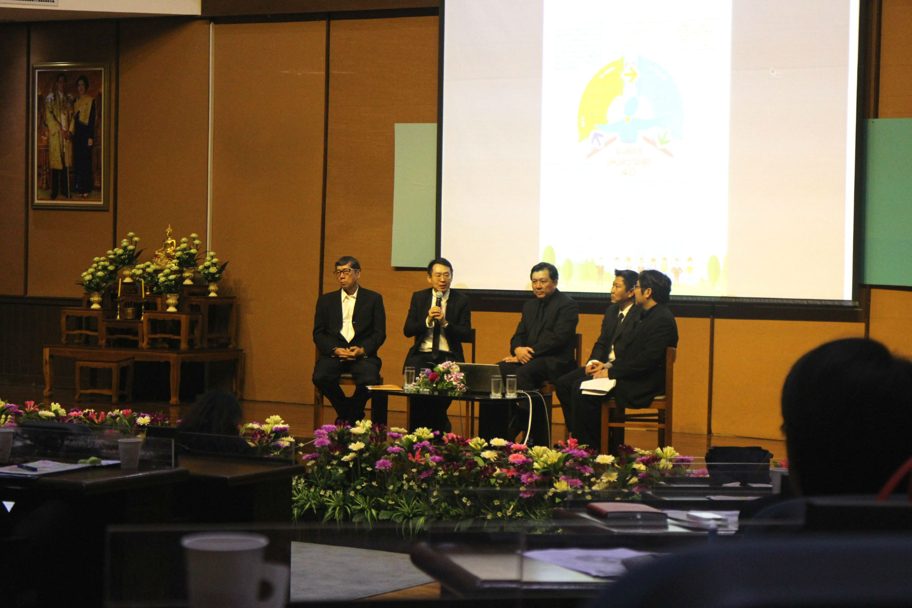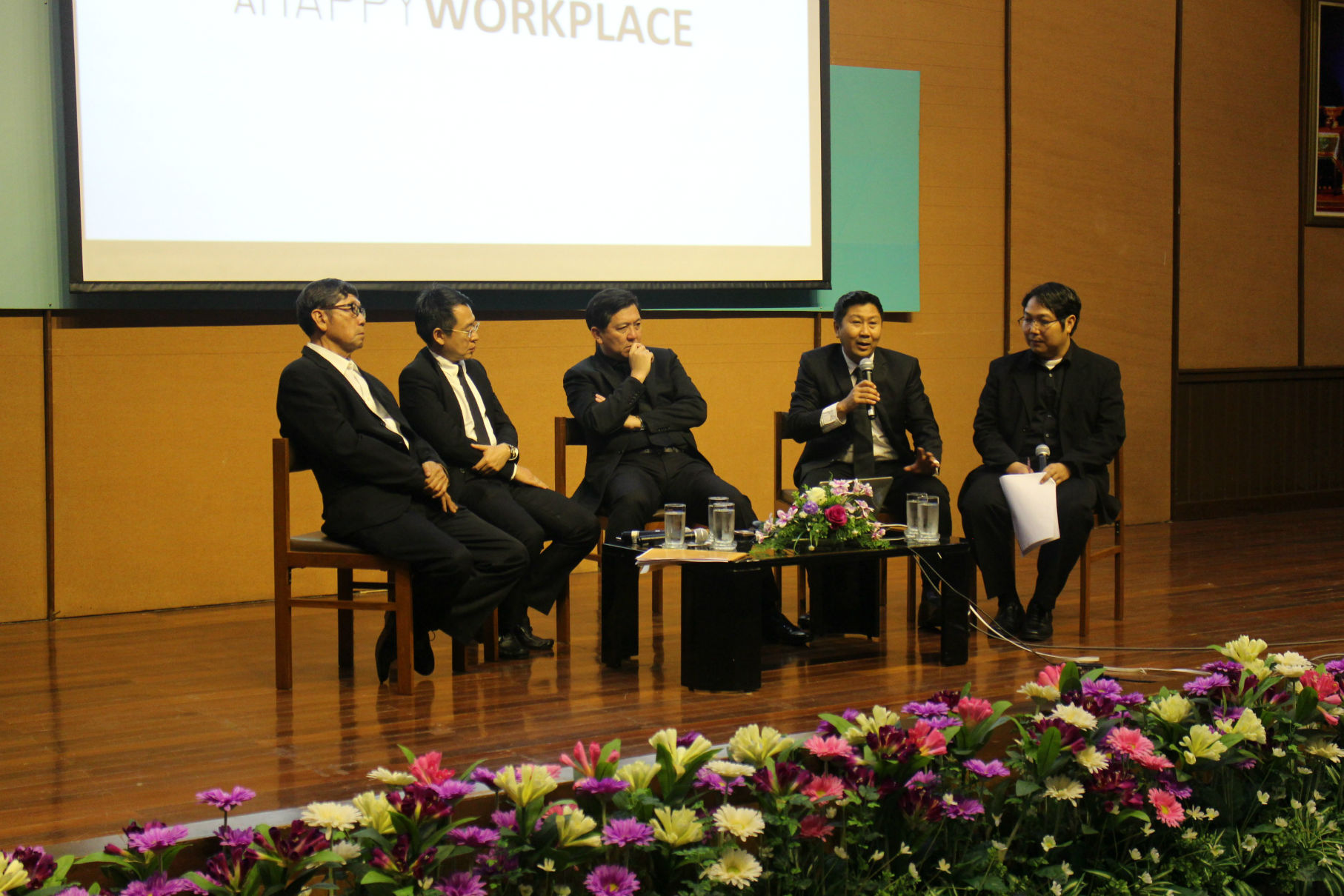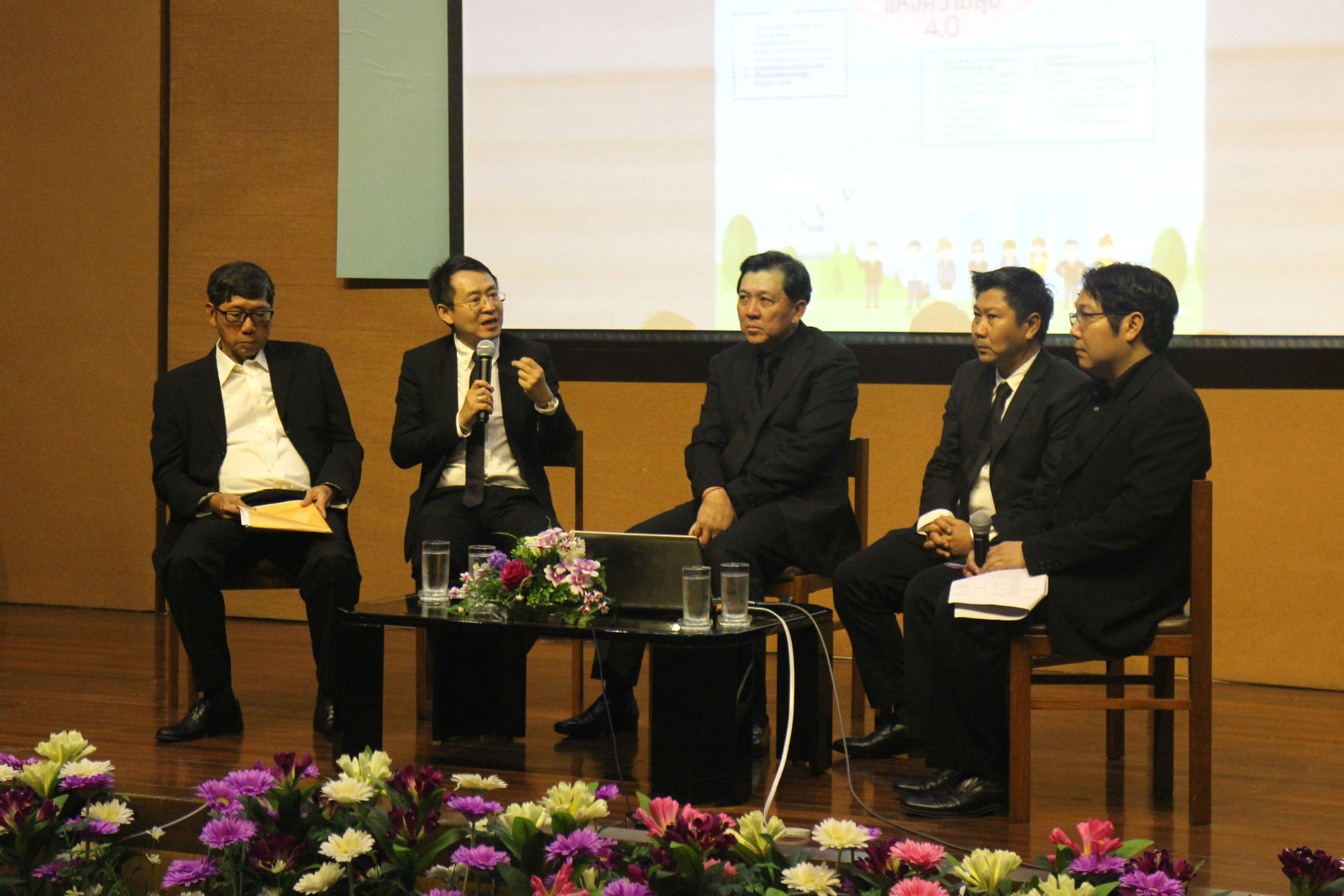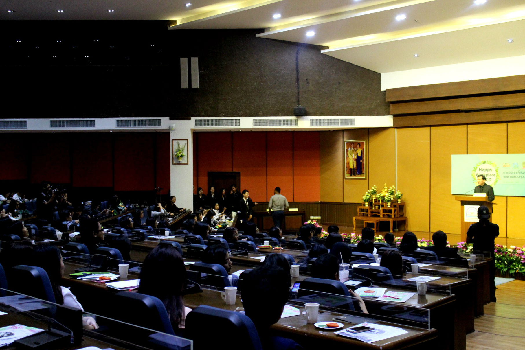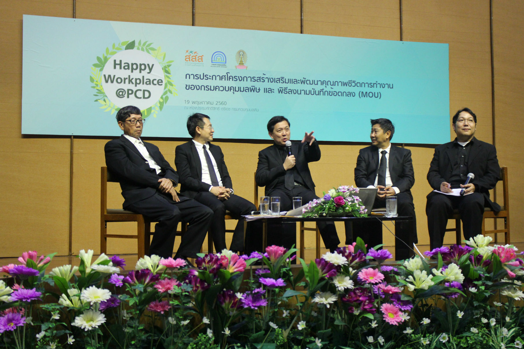 จากนั้นเป็นเวทีเสวนาเรื่อง “องค์กรสร้างสุข Thailand 4.0 เปิดผลสำรวจสถานการณ์คุณภาพชีวิตข้าราชการไทย และบันไดสู่องค์กรแห่งความสุขของคนทำงาน” ผู้ร่วมเสวนา ได้แก่ นายจตุพร บุรุษพัฒน์ อธิบดีกรมควบคุมมลพิษ นายแพทย์ชาญวิทย์ วสันต์ธนารัตน์ ผู้อำนวยการสำนักสนับสนุนสุขภาวะองค์กร สสส. นายสุจิตต์ ไตรพิทักษ์ กรรมการบริหารแผนคณะที่ 4 สสส. และ ดร.ศิริเชษฐ์ สังขะมาน หัวหน้าโครงการสร้างเสริมคุณภาพชีวิตการทำงานและเสริมสร้างศักยภาพองค์กรภาครัฐ ในระยะเปลี่ยนผ่านสู่การเป็นองค์กรสุขภาวะ สถาบันวิจัยสังคม จุฬาลงกรณ์มหาวิทยาลัย โดยมี ดร.กิตติพจน์ เพิ่มพูล รองหัวหน้าโครงการสร้างเสริมคุณภาพชีวิตการทำงานและเสริมสร้างศักยภาพองค์กรภาครัฐ ในระยะเปลี่ยนผ่านสู่การเป็นองค์กรสุขภาวะ เป็นวิทยากร