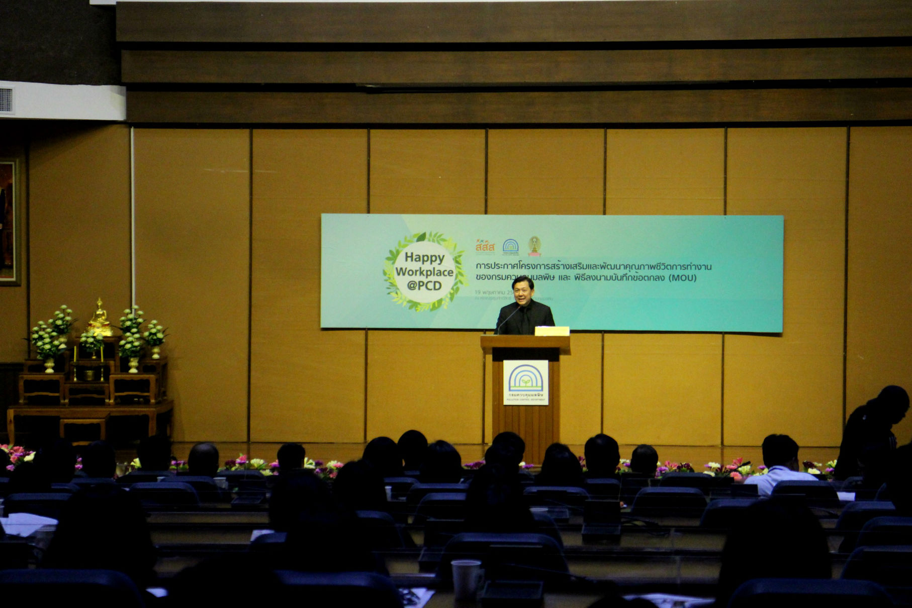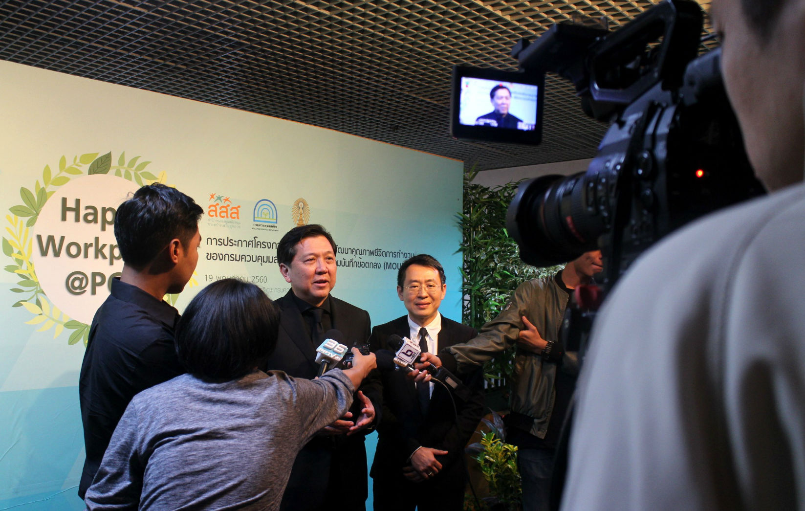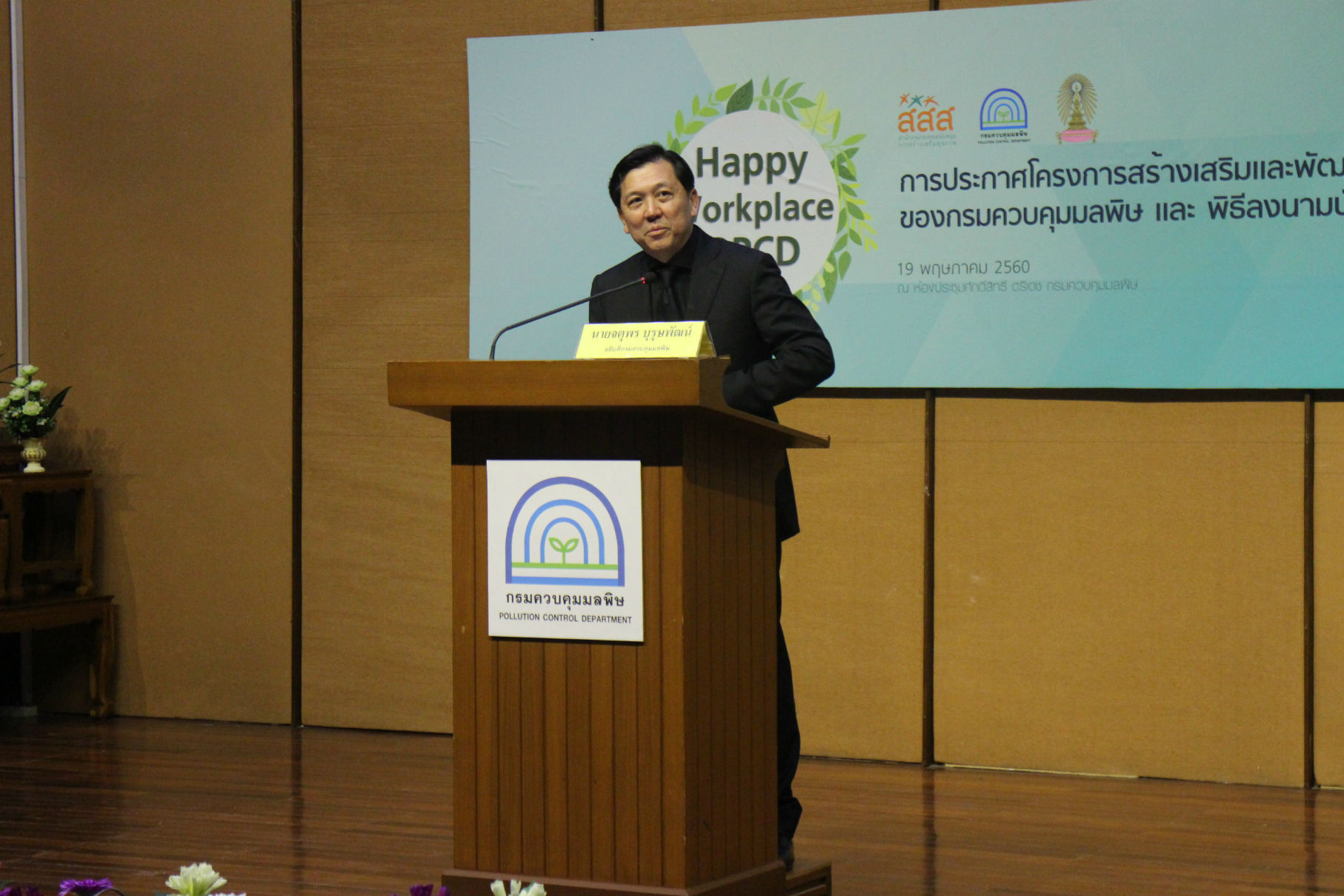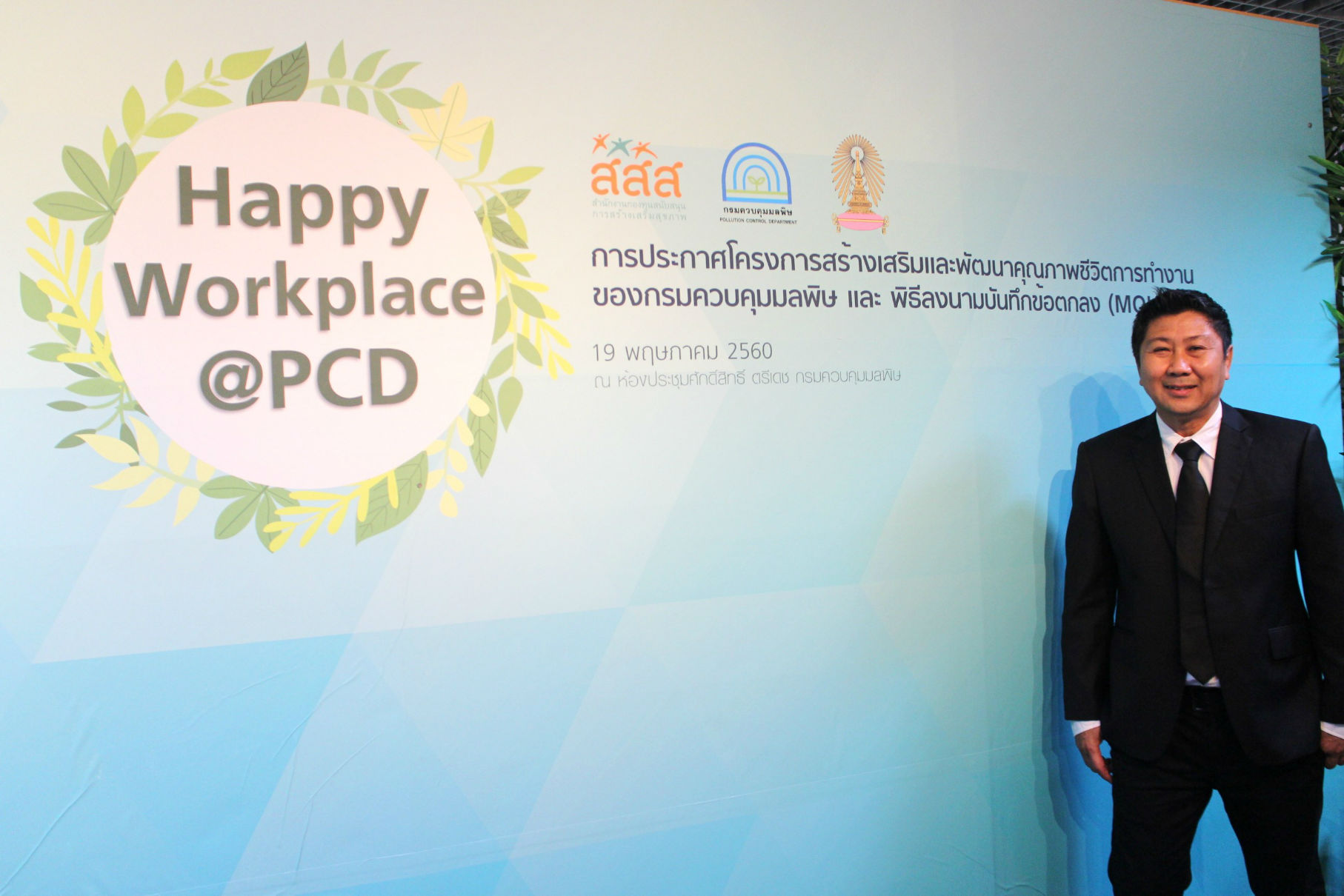 “การสร้างความสุขของคนทำงานด้วยการส่งเสริมให้เกิดคุณภาพชีวิตที่ดีขึ้นจะส่งผลโดยตรงต่อประสิทธิภาพการทำงาน กรมควบคุมมลพิษจึงร่วมกับสสส.เพื่อพัฒนาสู่องค์กรแห่งความสุข โดยตั้งเป้าหมายการลดความเสี่ยงต่อโรคอ้วนลงพุงด้วยการเปลี่ยนพฤติกรรมการบริโภค ซึ่งจะมีการปรับให้เป็นโรงอาหารกรีนเพื่อส่งเสริมการบริโภคผักและความปลอดภัยจากสารพิษ และเปลี่ยนอาหารว่างในการประชุมเป็นเมนูสุขภาพการชวนขยับกับบันไดสุขภาพและกิจกรรมออกกำลังกาย รวมถึงกิจกรรมอื่นๆ ต่อไป”อธิบดีกรมควบคุมมลพิษ กล่าว