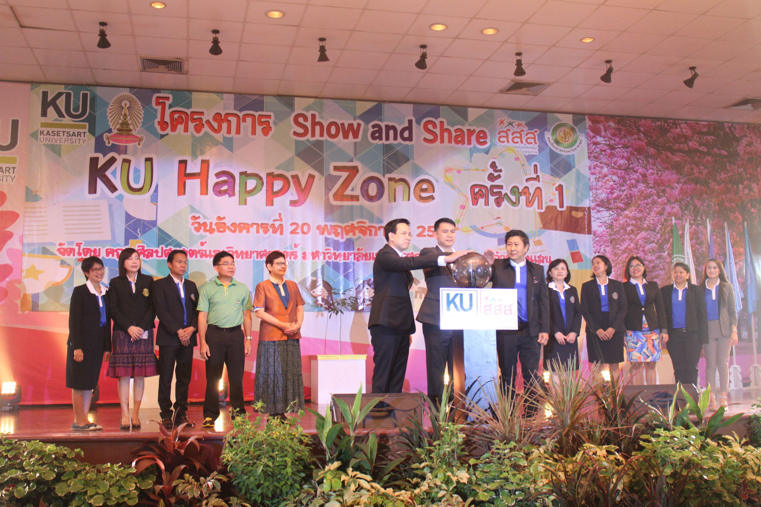 เมื่อวันอังคารที่ 20 พฤศจิกายน 2561 คณะศิลปะศาสตร์และวิทยาศาสตร์ มหาวิทยาลัยเกษตรศาสตร์ วิทยาเขตกำแพงแสน ได้จัดงาน Show and Share : KU Happy Zone ครั้งที่ 1 ภายใต้โครงการประชุมแลกเปลี่ยนเรียนรู้องค์กรแห่งความสุขอย่างอย่างยืน “Show and Share” ณ ห้องคอนเวนชั่น อาคารศูนย์ มหาวิทยาลัยเกษตรศาสตร์ วิทยาเขตกำแพงแสน กลุ่มเป้าหมายผู้เข้าร่วมงาน ได้แก่ บุคลากรคณะศิลปะศาสตร์และวิทยาศาสตร์ และเครือข่ายภาคีภายในและภายนอกมหาวิทยาลัยเกษตรศาสตร์ วิทยาเขตกำแพงแสน โดยมีวัตถุประสงค์เพื่อเป็นเวทีแลกเปลี่ยนเรียนรู้และเป็นศูนย์กลางในการให้คำปรึกษาการพัฒนาบุคลากรให้เกิดความสุขในการปฏิบัติงาน และเปิดโอกาสให้กับหน่วยงานต่างๆ ทั้งภายในและภายนอกมหาวิทยาลัยเกษตรศาสตร์ เกิดการเรียนรู้แลกเปลี่ยนประสบการณ์ระหว่างกัน