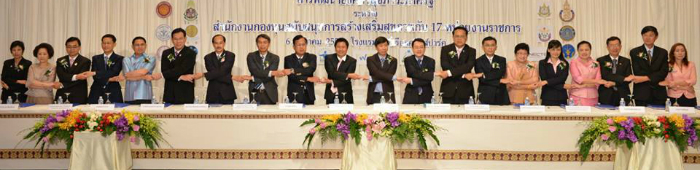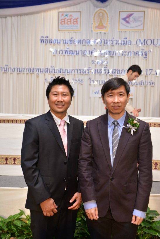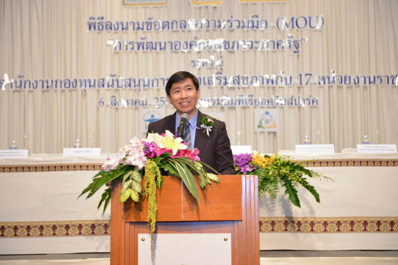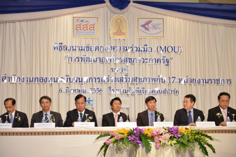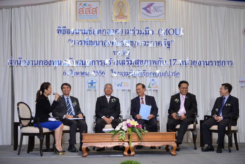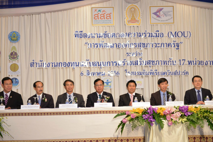 สำนักงานกองทุนสนับสนุนการสร้างเสริมสุขภาพ (สสส) และ สถาบันวิจัยสังคม จุฬาลงกรณ์มหาวิทยาลัย ร่วมกับผู้แทนจาก 17 ส่วนราชการจัดพิธีลงนามความร่วมมือ‘การพัฒนาองค์กรสุขภาวะภาครัฐ’ โดยมี ทพ.กฤษดา เรืองอารีย์รัชต์ ผู้จัดการกองทุนสนับสนุนการสร้างเสริมสุขภาพ สำนักงานกองทุนสนับสนุนการสร้างเสริมสุขภาพ และนายแพทย์ชาญวิทย์ วสันต์ธนารัตน์ ผู้อำนวยการสำนักสนับสนุนสุขภาวะองค์กร สำนักงานกองทุนสนับสนุนการสร้างเสริมสุขภาพ (สสส.) และ อาจารย์ ดร.ศิริเชษฐ์ สังขะมาน ผู้จัดการแผนงานสร้างเสริมคุณภาพชีวิตการทำงานองค์กรภาครัฐ ณ โรงแรมอิมพีเรียล ควีนส์ปาร์ค เมื่อวันอังคารที่ 6 สิงหาคม 2556