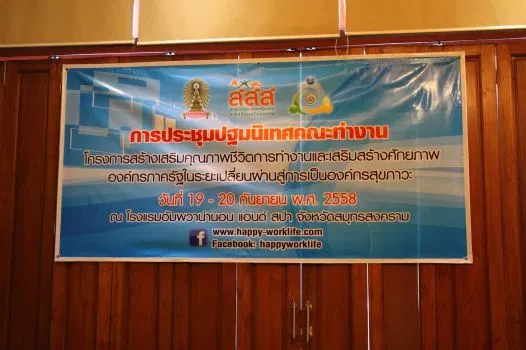 วันที่ 19-20 กันยายน พ.ศ. 2558 โครงการสร้างเสริมคุณภาพชีวิตการทำงานและเสริมสร้างศักยภาพองค์กรภาครัฐในระยะเปลี่ยนผ่านสู่การเป็นองค์กรสุขภาวะได้จัดประชุมปฐมนิเทศโครงการฯ ณ โรงแรมอัมพวาน่านอน แอนด์ สปา จังหวัดสมุทรสงคราม นำโดย ดร.ศิริเชษฐ์ สังขะมาน หัวหน้าโครงการฯ พร้อมด้วยคณะผู้ทรงคุณวุฒุคณะกรรมการแผนงาน นำโดย ท่านสุจิตต์ ไตรพิทักษ์ จัดขึ้น ณ รงแรมอัมพวาน่านอน แอนด์ สปา จังหวัดสมุทรสงคราม